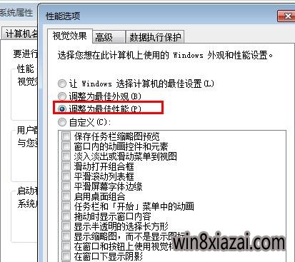 4、之后就能看到一个让系统选择最佳设置的选项,然后根据需要选择把功能选择成调节为最佳性能这个选项。