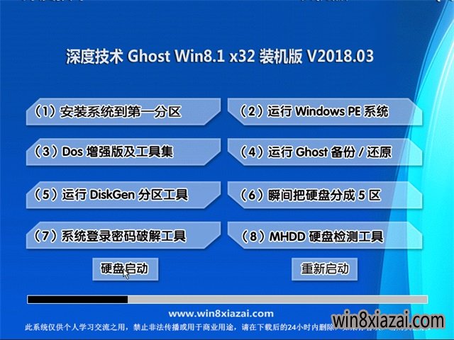 深度技术Win8.1x32位装机版系统仅用于进行演示基于万能GHOST的快速部署技术,供装机维护技术人员参考,我们不承担任何技术及版权问题,且不对任何资源负法律责任。所有资源请在下载后24小时内删除。如果您觉得满意,请购买正版 !!!