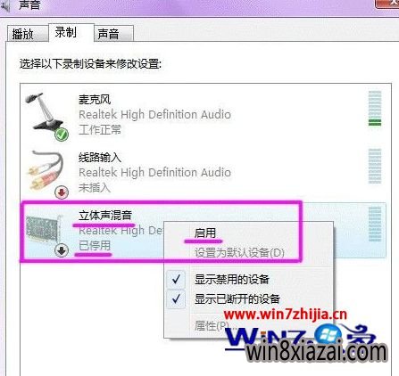3、看到“立体声混音”选项,在上面右键,选择“启用”;