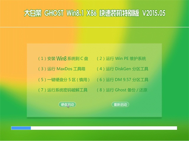 大白菜 GHOST WIN8.1 x86 快速装机特别版 2015.05具有安全性高、稳定性强、人性化设计、系统性能增强等特点,集成最常用的装机软件和最全面的硬件驱动。关闭系统还原,关闭自动更新,关闭流行病毒端口。集成常见硬件驱动,智能识别+预解压技术,绝大多数硬件可以快速自动安装相应的驱动。系统经过优化,启动服务经过仔细筛选,确保优化的同时保证系统的稳定,内存消耗低。实用,反应迅速。系统安装完毕自动卸载多余驱动,稳定可靠,确保恢复效果接近全新安装版!