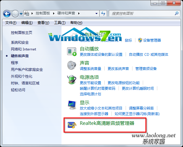 2.在“硬件和声音”界面中,选择“Realtek高清晰音频管理器”,如图2所示