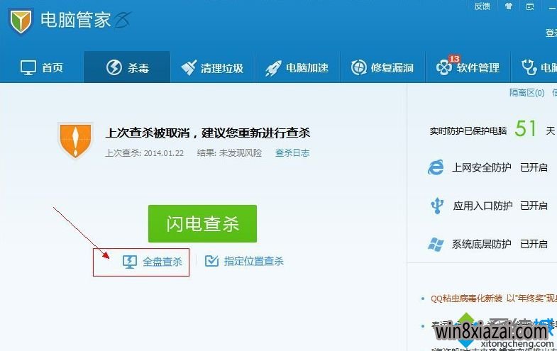 3、全盘杀毒会根据用户电脑所有文件大小决定查杀时间长短,装机系统,在我们查杀完病毒后我们可以根据管家提示的修复方案进行操作。